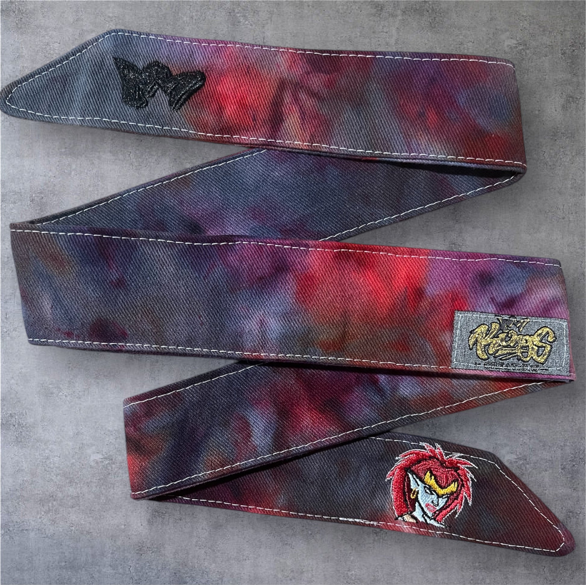 ANGEL OF THE NIGHT headband is hand dyed, sewn, and made in the USA. This band features our signature denim and unique terry cloth. The embroidery signifies the band belongs to a collection. All bands are unique and will age with use. To ensure dye retention we recommend using Castile soap, cold water, and hang dry. Tag not selectable. All bands are double embroidered (crown color not selectable).