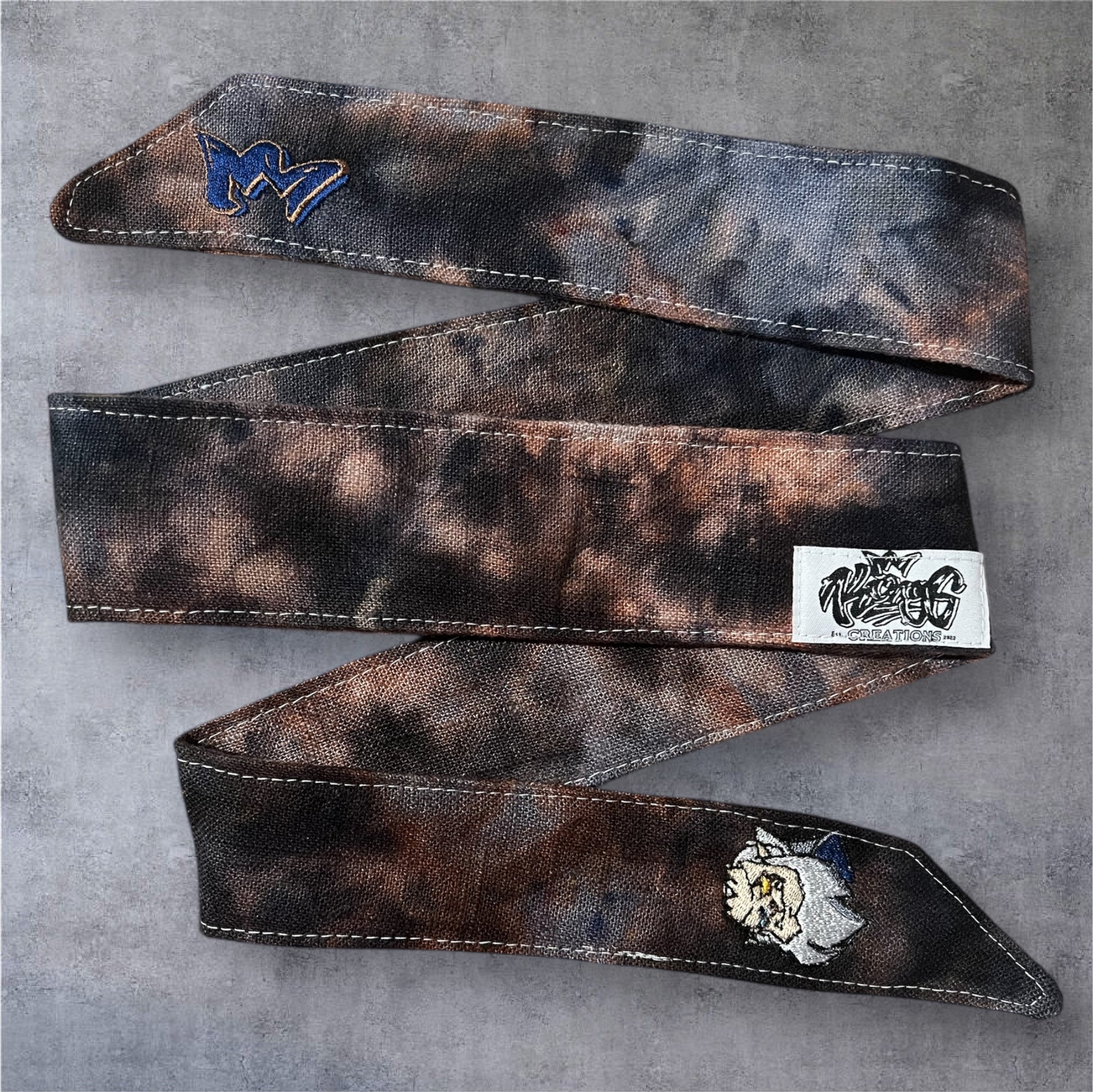 THE MENTOR headband is hand dyed, sewn, and made in the USA. This band features our signature cloth and unique terry cloth. The embroidery signifies the band belongs to a collection. All bands are unique and will age with use. To ensure dye retention we recommend using Castile soap, cold water, and hang dry. Tag not selectable. All bands are double embroidered (crown color not selectable).